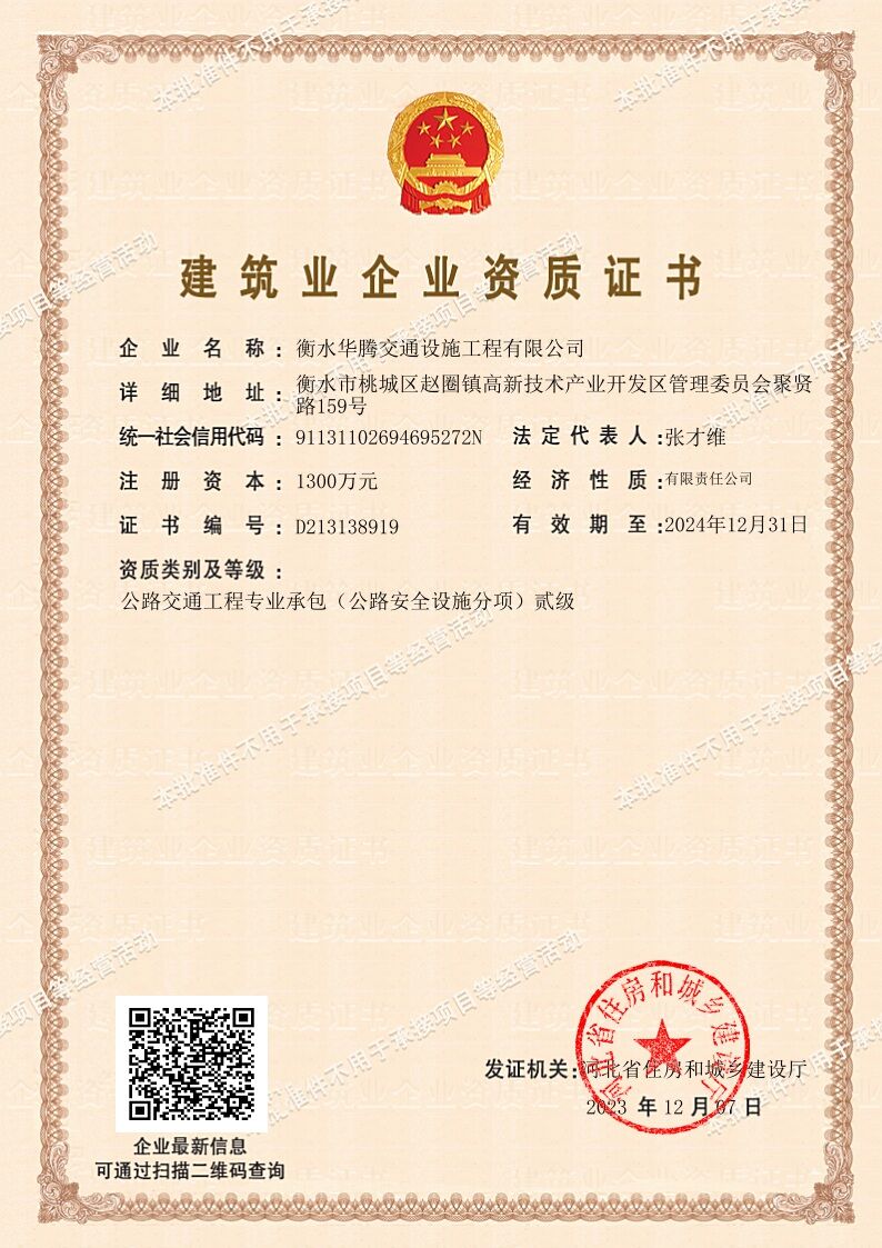 衡水華騰交通設(shè)施工程有限公司是一家公路工程綜合性企業(yè),具備河北省住房和城鄉(xiāng)建設(shè)廳核發(fā)的建筑業(yè)企業(yè)資質(zhì)證書(公路交通工程承包貳級(jí)),本公司承擔(dān)公路標(biāo)線、標(biāo)志、護(hù)欄、隔離柵、防眩板工程施工及按裝,并生產(chǎn)常溫型丙烯酸公路涂料、熱熔公路涂料、突起震動(dòng)涂料,以上產(chǎn)品完全由我公司生產(chǎn)合成完成,達(dá)到交通部JT/T280-2......